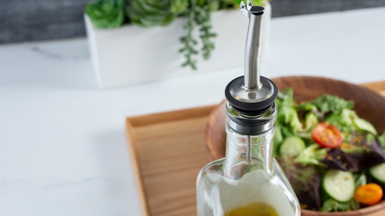 Glass bottles can make handy cooking oil dispensers with a pour spout attachment, similar to the ones bartenders use. A stainless steel cap with a suctioned base for the bottleneck will make a snug funnel to pour oil from while you're cooking, and the Axe Sickle stainless steel dispensers on Amazon can fit any ¾ inch bottle mouth. A handheld glass oil dispenser is easy to wipe clean, and it gives you enough motor control to measure liquids mess-free. You can use it to drizzle over salads or fill a measuring cup to bake a cake without overflowing. No drop of your lemon-infused olive oil is going to waste.