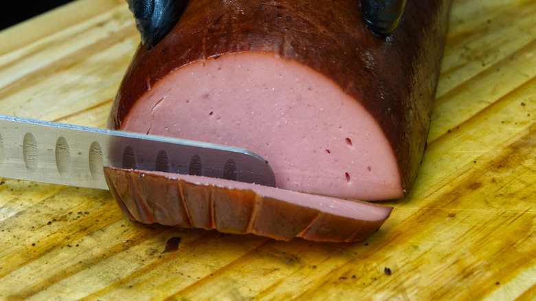 A slightly more complex but ultimately worthwhile method involves smoking a whole bologna log or slightly smaller chub-style portions. The bologna is scored, then slathered in mustard and barbecue rub before going onto an outdoor grill on a low temperature, around 225 to 250 degrees F, for around two hours. Some recipes go even further. After smoking the bologna, it's then sliced into smaller pieces and either quickly grilled on each side or covered in barbecue sauce and put back on the grill to smoke for another 30 minutes or so. Dress it up (like any other type of barbecue sandwich) with coleslaw and a drizzle of barbecue sauce. This is an inexpensive and delicious way to give your bologna a smoky makeover.