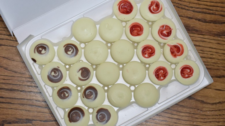 The box costs just under $20 and comes with 24 individual bites in three flavors: classic, chocolate, and cherry. The flavored cheesecakes come with extras are swirled on top and into the actual cheesecake mixture. They're very creamy with the nice tang that you expect from a quality cheesecake.
