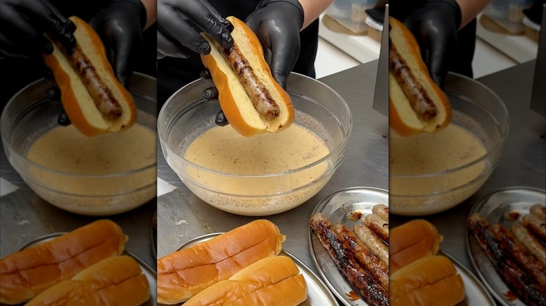Instead of using a traditional Frankfurt hot dog wiener, opt for proper breakfast sausage to give this culinary mashup a more familiar "morning meal" feel. Of course, not all breakfast sausages can fill a hot dog bun. To ensure an even bun-to-sausage ratio, use ground breakfast sausage and shape it into links that are the length and width of the bread before cooking it and fitting it into your bun. (Because the meat won't effectively cook when searing the batter, always assemble the hot dog with cooked sausage.) A meat casing or binding agent like breadcrumbs or potato starch will help ground pork sausage links hold their shape if needed. If you're using shorter breakfast links, simply slice the bun in half and enjoy bite-sized French toast hot dogs. Once your hot dog is ready, submerge it into the batter and cook it like regular French toast.