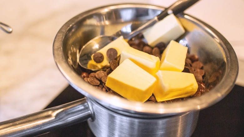 Whichever kind you're working with, Kasavan's go-to tools for melting chocolate are a double boiler or heat-proof bowl over gently simmering water, both of which will heat the wafers indirectly. She favors these methods because "This gradual method of melting the chocolate prevents it from scorching or seizing and ensures that the chocolate melts smoothly." In addition to following Kasavan's advice, try grating the chocolate bar into finer pieces first for an even easier melt.