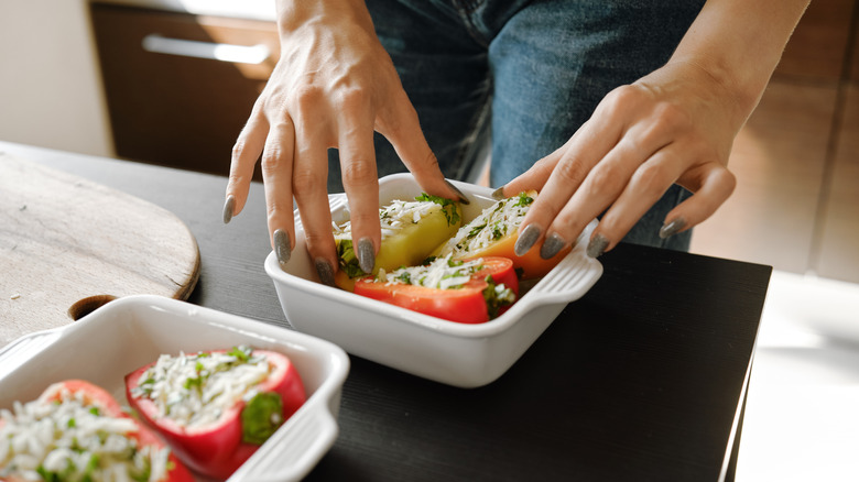 In his cookbook "Eating Royally," Darren McGrady lays out the recipe for these favorite stuffed bell peppers, but for those hoping to make it their own, there are a few simple twists to personalize the dinner Princess Diana loved so much. In the world of stuffed bell peppers, the first thing to know is that there are no rules. Putting a spin on the classic with barley and walnut fillings in stuffed peppers is a great way to enjoy a nuttier, meat-and-white-rice-free alternative that is wholesome and deeply comforting. If you're looking for a lighter meal (in honor of spring and summer weather), why not fill your bell peppers with your favorite salad, hummus, guacamole mix, or left-over ceviche? Ceviche in particular requires the perfect combination of juicy flavors, citrus, cilantro, and the perfect fish to tie it together. All of these flavors pair well with the roasted bell pepper, giving you a light and succulent pepper to tuck into.
