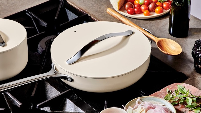 Customers say that these pans heat up evenly and retain that energy during the cooking time, with water boiling faster than stainless steel due to their aluminum core. The nonstick coating is said to last — of course, pending proper handling — with regular use. Avoiding the use of metal cooking utensils might be wise here. You'll have no trouble with delicate crepes, large fish fillets, eggs, sautéing vegetables, and many more tasks using Caraway's ceramic fry pan.