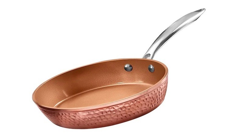 Copper pans may not be the most common today, but in reality, they have been around for thousands of years, as copper cooking vessels date back to the Bronze Age. Copper has long been lauded for its heat conductivity, as it heats up rapidly and then evenly distributes the heat, which helps avoid hot or cold spots. Cookware technology has advanced quite a bit since the early metal age, where we see a hyper-modern take on a copper pan with Gotham Steel's Hammered Copper 12-inch Nonstick Frying Pan. This pan has a unique, artisan-like quality to it, with the dimpled exterior texture that is, you guessed it, hammered.