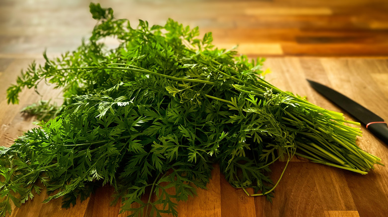 Additionally, carrot top pesto is chock-full of nutrients. Carrot tops have a whopping six times more vitamin C than their popular orange root. They're also packed to the leafy brim with potassium, calcium, and phytonutrients, so this unconventional pesto alternative proves itself a mighty health boost as well as a mouthwatering, money-saver meal. Because this sauce is so fragrant, it's best to keep the dish simple with a curly short pasta shape. Adding chopped or julienned root veggies can infuse brightness and texture to the plate too.