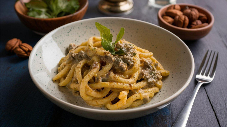 Originating in the Italian region of Liguria, walnut sauce is nutty, earthy, and much cheaper to make than most pesto recipes due to the use of walnuts rather than pine nuts. It features a subtle umami flavor from the garlic, cheese, and milk-softened bread. All of this combines into a sauce that's velvety on the tongue and tastes amazing on crostini, vegetables, or even poultry. It's an all-purpose sauce because of its versatile flavor profile and simple texture, and thanks to the generous profusion of walnuts, it's also extremely beneficial for your brain health.