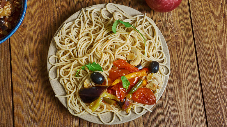 Oyster sauce is an absolutely unconventional selection for pasta, but purists are missing out on this Asian fusion recipe. This savory condiment is viscous and full of umami, and it's not particularly fishy either. So if you're not a huge fan of the strong taste that permeates clam sauce or seafood-based pasta dishes, oyster sauce is a gentle, rounded way to experience what the ocean has to offer without being too pungent. Oyster sauce is particularly fragrant when stir-fried, which is why you'll find it most often in Chinese restaurant cooking.