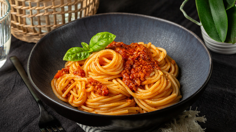 It's hard to think of Bolognese without its trademark minced meat, but hope is not lost for vegan appetites. Silken tofu can be used as a protein replacement in pasta and other creamy dishes because of its high water content, meaning that it can be ground up without turning gritty like most tofu varieties. The resulting sauce is deliciously thick, velvety, and just as silky as the tofu used inside. All you need is the classic soffritto of vegetables, which typically includes diced celery, onions, and carrots. Add tomatoes, and you can also include spinach, roasted red peppers, and white or cremini mushrooms to the mix for a variety of flavors and textures.