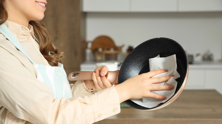 You can probably think of a million uses for kitchen towels, and they will probably all work, but some uses are better left to different tools. Soaking up excess oil from food is a great example. If you've got an extra-greasy pizza on your hands or went a little overboard with the cooking oil in a stir fry, you might be tempted to soak it up with the nearest towel. But when a towel comes into contact with oil, the oil can infiltrate the fibers of the material and stick, leaving unsightly stains and lingering odors. And the longer you leave those stains, the harder they are to remove. Unless you plan to wash your towel immediately, you'll want to avoid this habit altogether and use disposable paper towels to soak up that excess grease and oil.