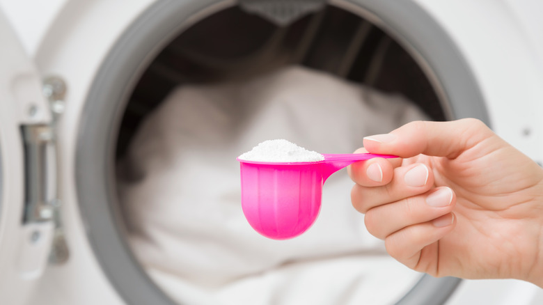 Laundry soap serves an important purpose, but it is actually a harsh chemical that can do some damage if used in excess. And kitchen towels take a lot of abuse, so it is tempting to toss in a little extra soap when you stick them in the wash to clean off stinky and unsightly food stains — after all, if they don't look and smell clean, you won't want to use them in your kitchen around the food you eat. It's a common misconception that when towels are really dirty, it takes more soap to clean them, but the truth is that extra detergent will simply linger on the material rather than wash off in the rinse cycle. This will leave your towels stiff and ineffective in the kitchen.