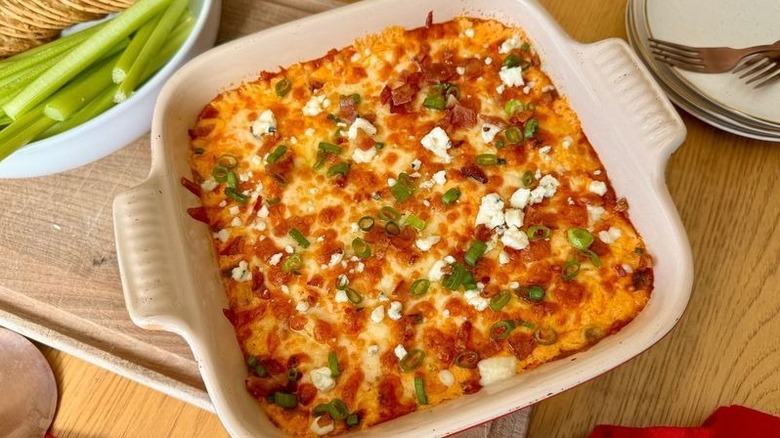 Anyone who has enjoyed Buffalo chicken dip knows that goes well with pretty much anything, so you can serve it with your favorite accompaniments — for Rosenhouse, these are crackers and celery sticks. But this dip goes well with anything substantial enough to scoop up all the cheesy goodness. "This dip would pair well with any of your favorite dippers, whether fresh crudites, pita chips, pretzel chips, toasted baguette slices, or more," Rosenhouse tells us. Anything store-bought is perfectly acceptable, and you could even use store-bought pizza dough to craft your own baguette, before baking it and slicing it up to enjoy with this dip.