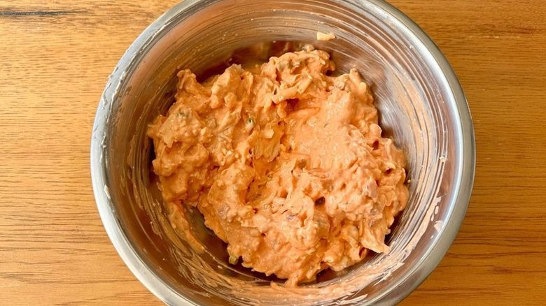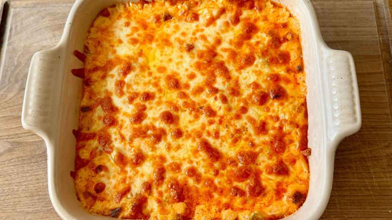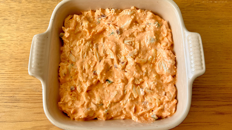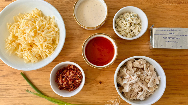 Even if you don't want to prepare the whole dip beforehand, you can still prep certain ingredients to make your life a little easier once the time to assemble does come. The recipe calls for cooked, shredded chicken breasts, so you can cook those as you're making the whole dip itself, or you can cook and refrigerate them for up to three days in advance. Otherwise, Rosenhouse notes that rotisserie chicken is an easy swap that requires no cooking on your part — simply shred it and you're ready to add it to the dip.
