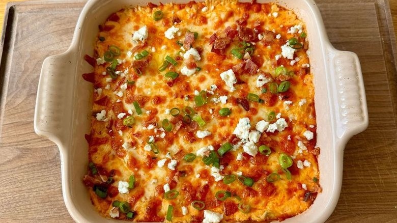 Dip is always a welcome dish at any potluck or game day, whether it be something as simple as guacamole or as intricate as a seven-layer dip. Another much-appreciated food at any good gathering is Buffalo chicken wings. So naturally, this Buffalo chicken dip is the perfect best-of-both-worlds fusion that satisfies nearly everyone in the crowd. This Buffalo chicken dip recipe, from developer Katie Rosenhouse, has an added make-ahead quality, which removes the stress of prepping it for your gathering.