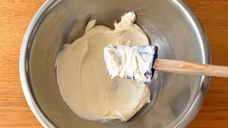 - Stir the cream cheese in a large bowl until smooth.