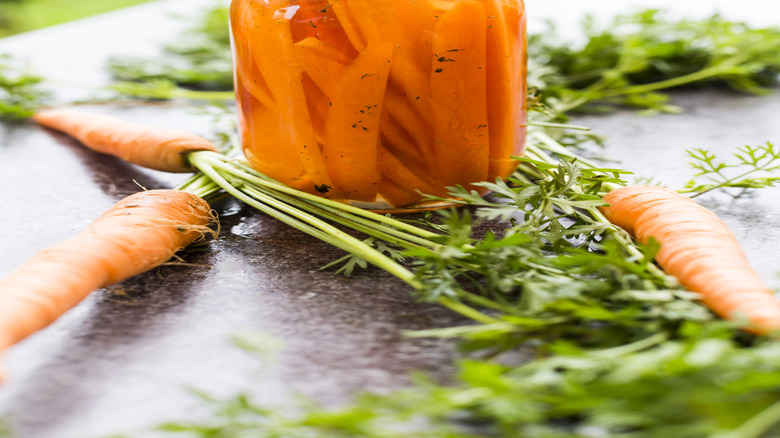 With his characteristic chefly flair, James Callery describes pickles thusly: "Pickles are the responsible friend who swoops in with a zing of acidity, cuts through all that fatty excess, and makes sure you don't regret your life choices afterward. Plus, that crunch? It's like a standing ovation for your teeth." Carrots achieve this admirably, because they're very crunchy to start with, and they keep that crunch through the pickling process. As Sammy Gianopoulos notes, "Shredded or sliced pickled carrots add sweetness with a zing." This works particularly well with banh mi-inspired flavors or veggie burgers.