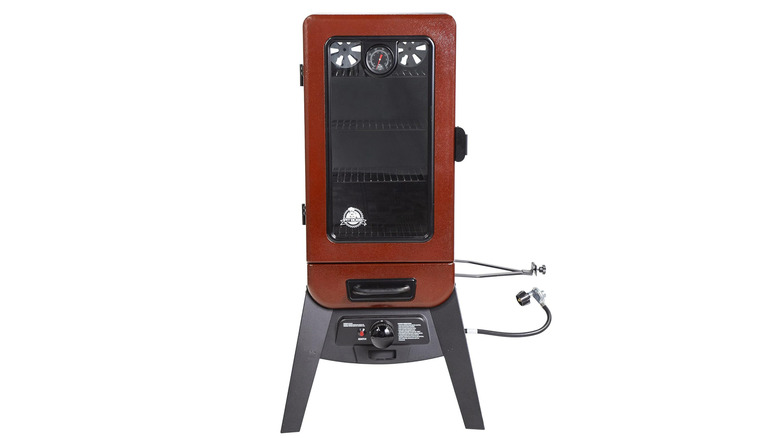 Pit Boss is certainly a popular brand when it comes to smoking, and the Pit Boss Grills PBV3G1 Vertical Smoker has made our list for having an eye-catching yet functional design. It comes in a snazzy burnt-red color and allows for external wood chip and ash tray removal, which means you won't need to open the main door while smoking. The dual valve/burner system has one burner for wood chips and another to maintain cabin temperature. With 880 square inches of cooking space, it's one of the larger capacity smokers on the list.