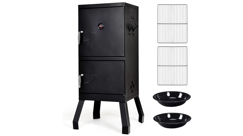 Pitmasters looking for a smoker that they can tinker with will enjoy the Giantex Outdoor Smoker. Many reviews said they liked that this model is easy to modify and add on to in order to create the perfect smoker. It's a good base model that's on the lower end of the price spectrum at $149.99. The smoker comes with a thermometer on the door and four vents on the side. It uses charcoal but has a double-door design so you can reload your fuel and wood for smoking without bothering your meat or veggies. It also has two detachable grill nettings and can roast as well as smoke.