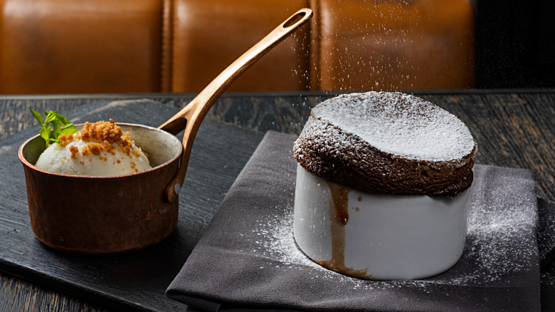 In 2022, chef Geoffrey Zakarian dropped the recipe for his favorite dessert, a raspberry soufflé, on his Instagram account and said that a soufflé was a beloved sweet treat for him. Soufflés are flour-free desserts made mainly from egg whites and yolks plus sugar, but rather than turning out like crunchy meringue cookies or pavlovas, a soufflé ends up being like a very airy cake. The name is derived from the French word for "to puff," and soufflés are famous for their rise during baking. Legend had it, according to many TV shows, that one loud sound would supposedly cause the soufflé to fall and ruin that desired puff. That, of course, was a myth, but soufflés have had a reputation as being very fancy.