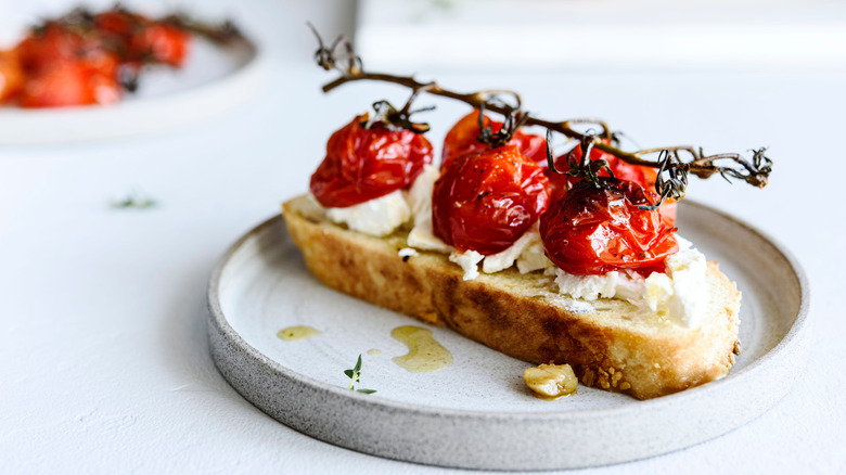Tomato confit is the wonderfully easy preparation that turns a vine of these petite nightshades into a vibrant accompaniment that will transform something as simple as a baguette into a headlining appetizer. Confit, of course, refers to the process of cooking an item in fat (or sugar syrup in the case of fruit) at a relatively low temperature. Etymologically, the word confit traces back to the French verb English speakers would use for "preserve," but most present-day applications are for serving right away, like in this case with tomatoes. And because tomato confit requires cooking with a large quantity of olive oil (they'll practically be submerged), you'll want to make sure it's the right kind and of the right quality.