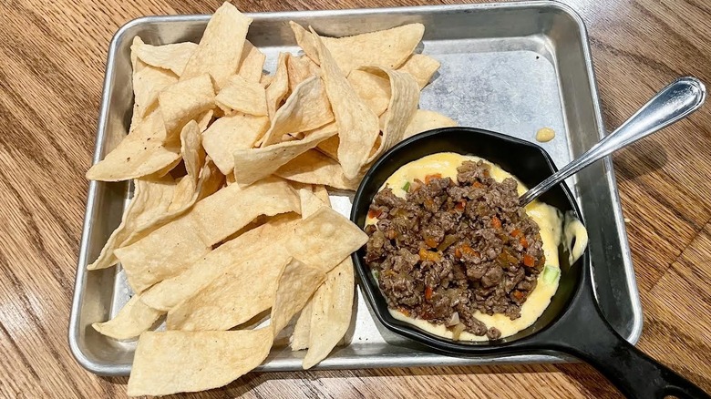 Outback Steakhouse's 3 Cheese Steak Dip is a classic case of the menu picture not living up to the dish you get served. In the photo, it looks like you get actual slices of steak piled on top of queso, but when this appetizer arrived at our table, the meat looked more ground. So, even before diving in for a taste, it wasn't off to a good start. It's a shame, too, because this is a new appetizer (it's not even on the full menu yet — it's still on the specials sheet).