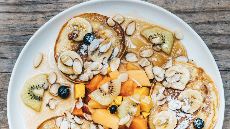 Fluffy, piled high, and topped with butter, fruit, and syrup, pancakes are a breakfast or dessert dish that transcends borders or national affinity. Here in the U.S., we have a tendency to use tried and true mixes — brands like Bisquick, Krusteaz, and Hungry Jack — but it's always good to shake things up with unexpected upgrades once in a while. Our southern neighbors in Mexico have their own preferred brands resulting in a subtly different, but no less delicious pancake, especially with unique toppings such as caramel-like dulce de leche, sweetened condensed milk, and honey.