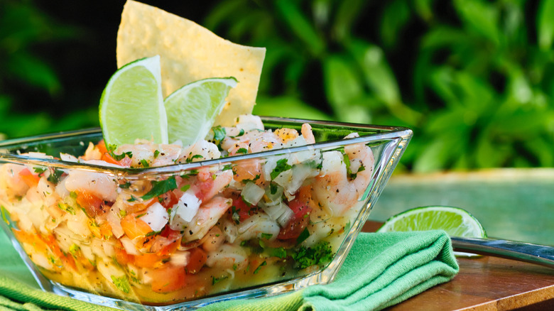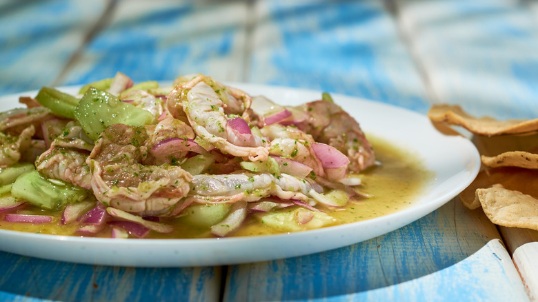Ceviche may have originated in Peru, but it's also popular all over Latin America, and especially so in Mexico. At its most basic, ceviche includes diced pieces of raw fish or shellfish in a tangy citrus-based marinade. The acid in the citrus juice reacts with the proteins in the seafood, causing the meat to firm up and take on an opaque character. Recipes vary considerably with many people adding an array of ingredients to complement the fish. However, the end goal is always a refreshing and flavorful dish that's perfect as a snack or light meal on a hot day.