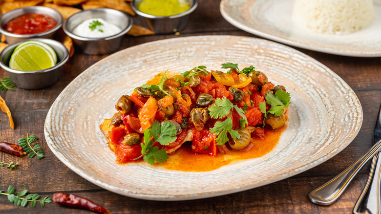 There are several ways to make huachinango a la Veracruzana, but it all starts with red snapper — either a whole fish or filets. The fish is usually marinated in lime juice, salt, and pepper, and then seared in a pan. Then it's simmered with a sauce that includes tomatoes, onions, jalapeños, green or black olives, oregano, capers, and chicken stock or water. Some people choose to bake the fish with the sauce instead or grill the fish and top it with the sauce afterward. Whatever way it's cooked, it comes out brightly colored and bursting with sweet, briny, tangy, and umami flavors.