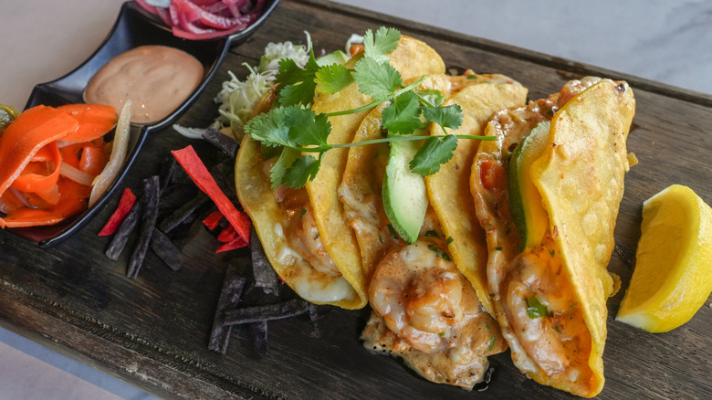 Legend has it that tacos gobernador was created in the late 1980s or early 1990s at a restaurant called Los Arcos in Mazatlán, Sinaloa. At that time, Sinaloan governor Francisco Labastida Ochoa was in town and planning to visit the restaurant. The chef knew that Ochoa loved shrimp tacos, so the dish was a riff on that. Tacos gobernador was a hit, and it soon spread to other restaurants in Mazatlán and all along the Pacific coast. It's easy to see why people love the dish — it's basically a savory, seafoody, taco-quesadilla mashup.