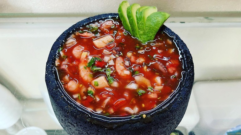 What do you turn to when you're in dire need of a hangover helper? For many Mexicans, the answer is vuelve a la vida. The name translates to "return to life" and it's essentially a seafood cocktail. Don't expect a few sad shrimp lining a glass filled with generic shrimp cocktail sauce though. Vuelve a la vida can be a meal in itself. It typically features a mix of shrimp, octopus, oysters, and other shellfish, all tossed in a tangy, tomato-based sauce made with lime juice, hot sauce, jalapeños, and fresh herbs. It's a bold, refreshing dish that many swear by after a big night out.