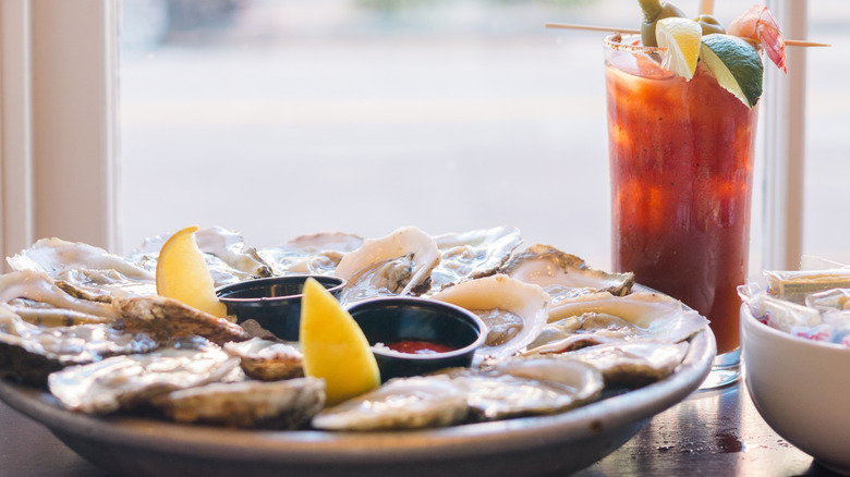 To combine both qualities into one package, whip up a bloody mary. This tomato juice-based drink with its common fixings of horseradish, hot sauce, and lemon — all staple condiments at an oyster bar — contains the citrusy tanginess, tomato-derived umami, and dash of heat that go with the mollusk's marine notes. Instead of throwing garnishes directly onto the oyster, a bloody mary lets you sip complementing flavors alongside. In fact, some historians even suggest the bloody mary descended from a 19th century boozeless drink called an "oyster cocktail;" truly a sign that the flavors were destined to meld.
