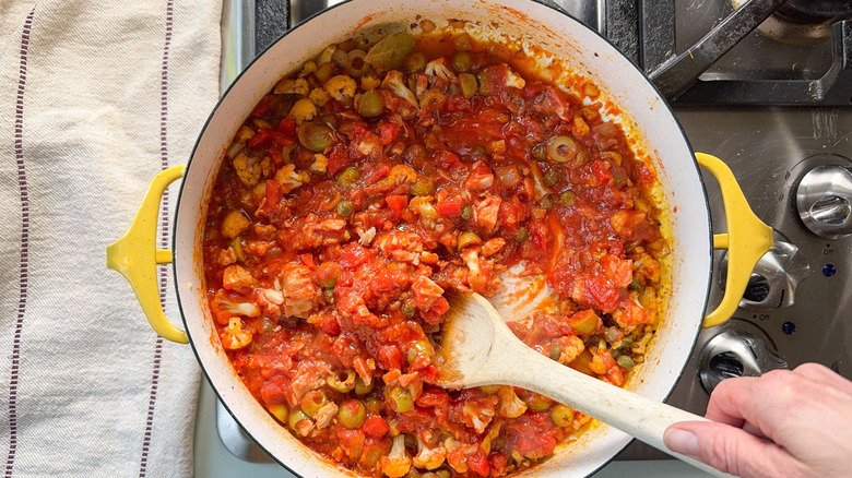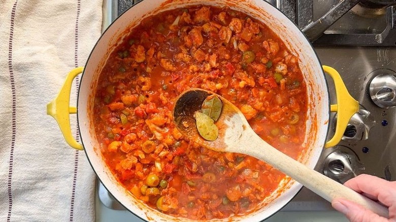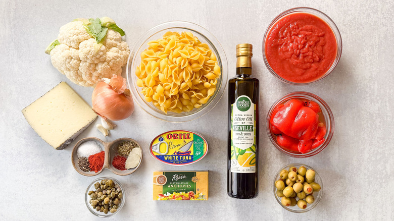 To achieve authentic Spanish flavor in this recipe, try using ingredients straight from the source — starting with some good Spanish olive oil for sauteing and for drizzling the dish at the end. You will need a variety of popular Spanish vegetables, including white cauliflower, yellow onion, and fresh garlic. To achieve the rich romesco-y flavor, use roasted red peppers (a jarred variety works well) and tomato puree. Flavor the sauce with smoked Spanish paprika, dried oregano, bay leaves, chile flakes, kosher salt, and freshly cracked black pepper. Once the sauce has simmered, you will remove the bay leaves, as they are intended to add a subtle herbaceous flavor but are it's not safe to eat bay leaves. Tinned Spanish tuna and anchovies packed in olive oil give this casserole its distinctive taste of the sea. Pimento-stuffed Spanish manzanilla olives and brine-packed capers add a zesty balance to the richness of the manchego cheese (which is also good on pizza). Kinnaird likes using a medium shell pasta to complete the dish, however, any chunky medium-sized shape will work.