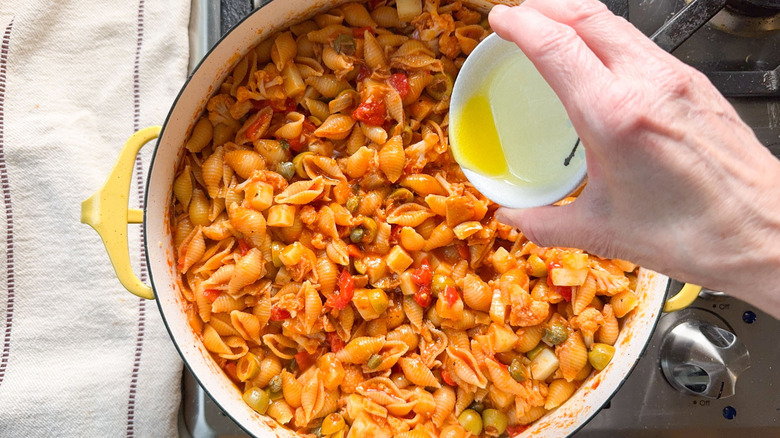 - Uncover the pan, stir in the cheese, and drizzle the top of the pasta with the remaining 2 tablespoons of olive oil.