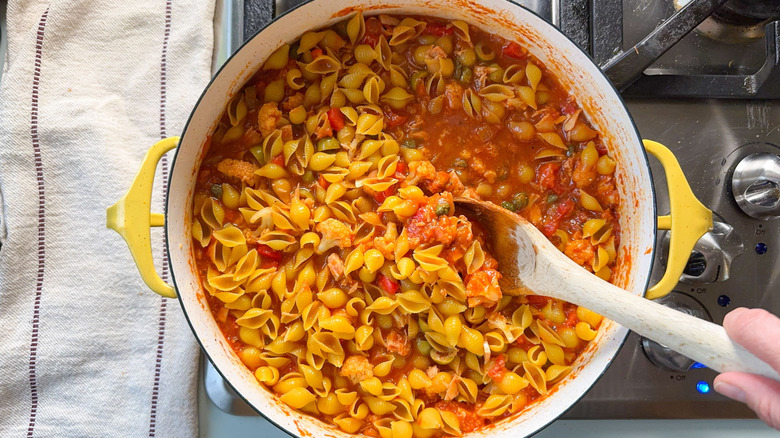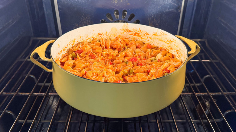 - Reduce the heat to low, cover, and simmer for 10-12 minutes or until the pasta is al-dente and most of the liquid has been absorbed.