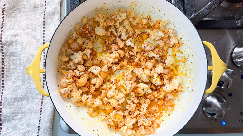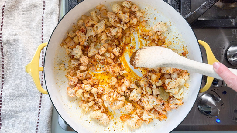 Step 3: Add the cauliflower, aromatics, and seasonings