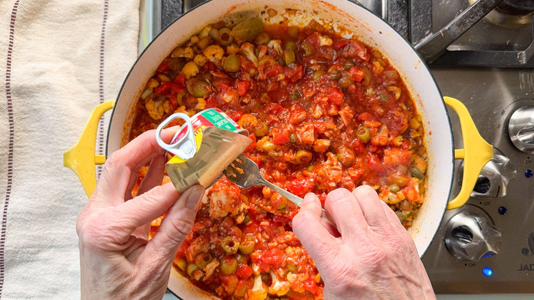There are plenty of ways you can customize this pantry-friendly recipe. For the tuna, even if you don't have a Spanish variety Kinnaird suggests sticking with an olive oil-packed selection. The oil retains the flavor, so it's a waste to wash it away as you do when you drain water from canned tuna. And if anchovies are not your thing, it is fine to leave them out but you will miss out on some of the delicious umami flavor they impart. For the olives, Italian Castelvetrano or French Picholine will provide a compatible olive flavor — just be sure to get pitted varieties.