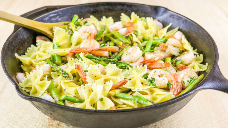 Though it's not quite a one-pot dish, Garten's recipe couldn't be simpler. Get a pot of salted water boiling and throw in your chopped broccoli for a few minutes until it's bright green. Remove and put aside, then cook your bowtie pasta in the same pot. While that cooks, get together a simple pan sauce of toasted pine nuts, good-quality olive oil, butter, minced garlic, and fresh lemon juice. Once the pasta is done, toss everything together and top with a healthy amount of parmesan cheese and black pepper. It's easy, it's delicious, and it's endlessly adaptable.