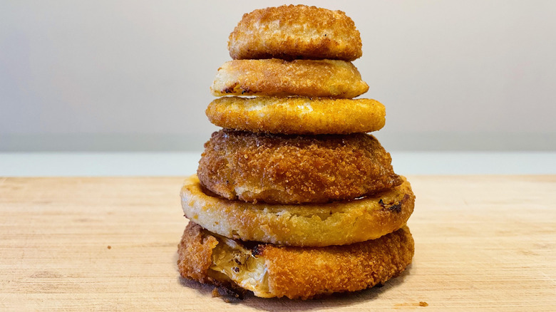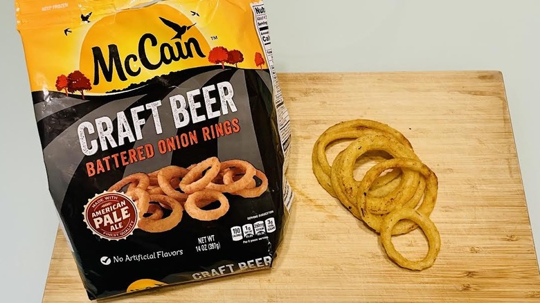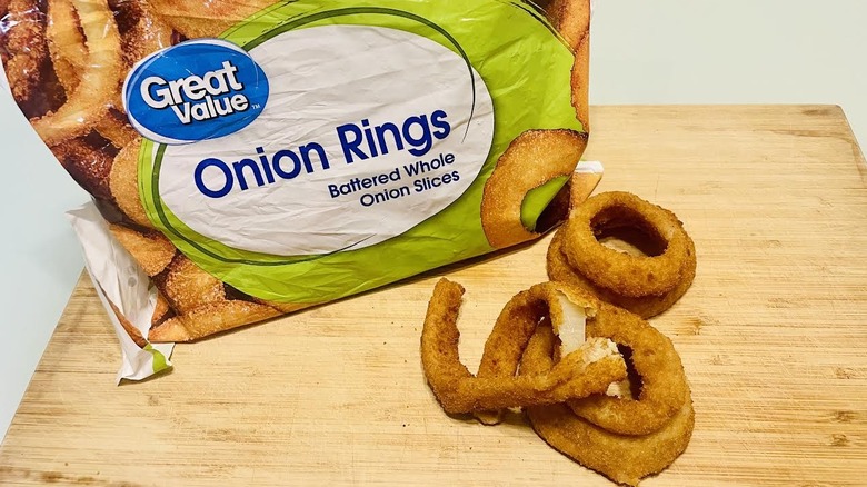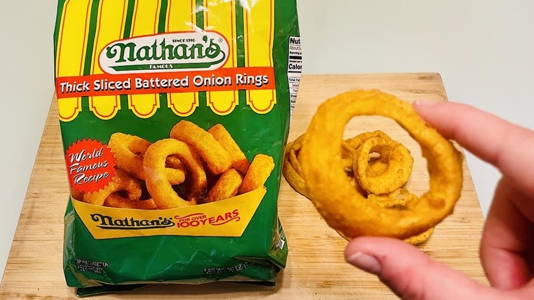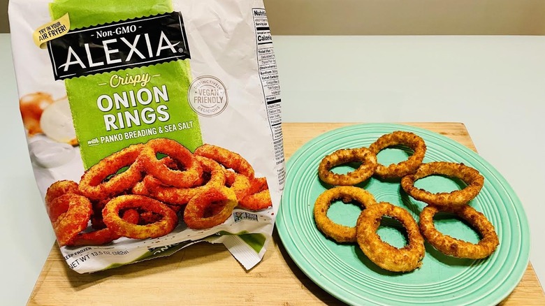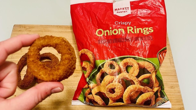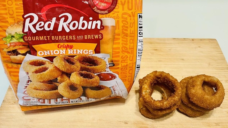 Whether you're enjoying a burger, steak, or another savory entree, onion rings make a drool-worthy accompaniment. They offer a burst of onion flavor and crunchy texture that people can't get enough of, and honestly, onion rings can even give french fries a run for their money when done right. Still, making onion rings from scratch is a labor of love that many of us aren't ready to take on, at least not regularly. That doesn't mean you have to go without, though. There are quite a few tasty frozen onion ring brands that you can easily pick up from the store. I should know — I just taste-tested every brand I could get my hands on.