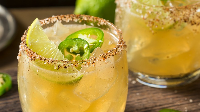 Tajín rims have started garnering popularity as a vibrant twist on regular salt. This Mexican seasoning — made from a blend of chile peppers, lime, and sea salt — creates a spicy, tangy contrast that amplifies the margarita's refreshing tartness. If you love a little heat, this rim is a must-try. You can buy standard bottles of Tajín in the grocery store or on Amazon, but if you plan to use it primarily for drinks, buy the shallow tub of Tajín to make rimming easier.