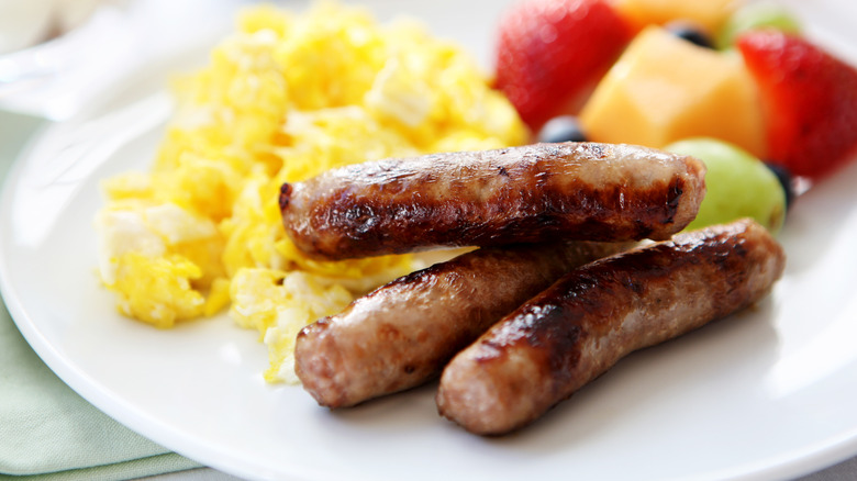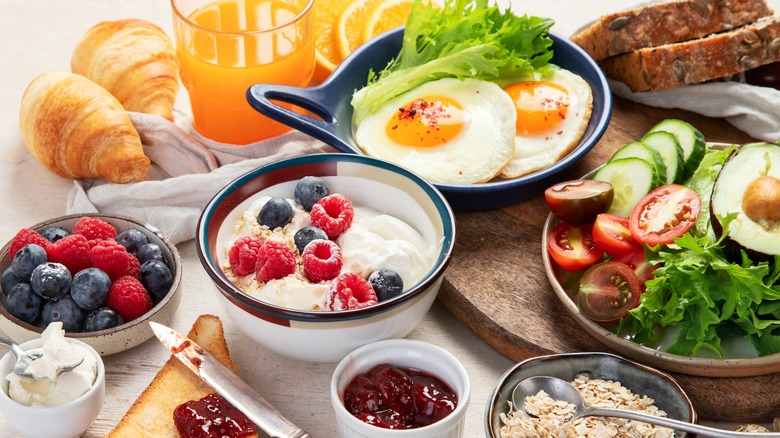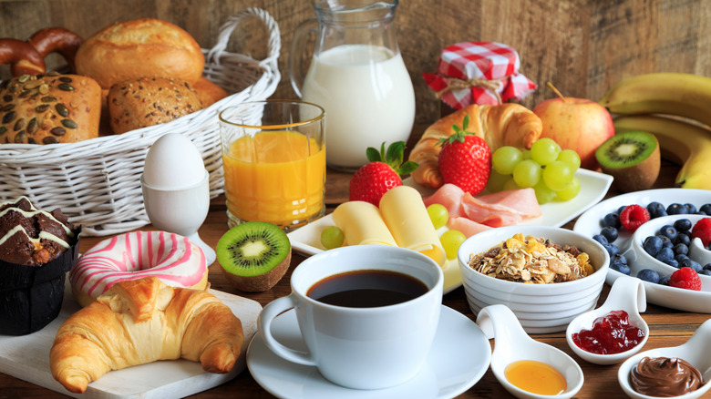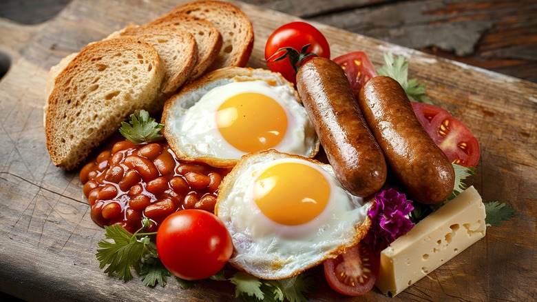 However, most Americans are also familiar with the combination of bacon, sausage, toast, and eggs — though U.S. diner menus usually offer either sausage or bacon, not both. The idea in the States seems to be centered around creating a balanced plate with lots of variation, allowing those dining to customize their plate as much as they like. For instance, you can get your eggs fried, scrambled, or basted, just to name a few. If bacon and sausage aren't your thing, steak is an option in some areas, as is scrapple — a salty and savory pork pate popular throughout Pennsylvania. Or, if you're in Hawaii, spam is a popular protein.