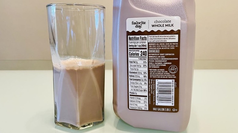Target's Favorite Day Chocolate Milk gets much closer to the mark than other grocery store brands on this list, minus Lucerne and Trader Joe's (which you'll learn about further down this list). For a generic brand, it's actually quite tasty and it has a pretty good texture too, so it's most certainly a better option than the lower-ranking brands.