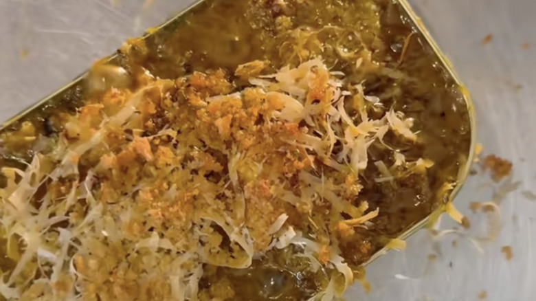 Poor Man's Oysters Rockefeller, as they're known on TikTok, can be made in multiple ways. In general, though, you add some variation on the generic ingredients, such as lemon, seasonings, and parm to a can of oysters and bake it up, then dig out the goodies with crackers or bread. Spinach, crème fraîche, and paprika sometimes make appearances as well.