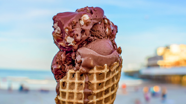 It's no surprise that the pastry chef and Food Network host Duff Goldman loves Ben & Jerry's. The brand is famous for not only their range of ice cream flavors, but for their refusal to sell a plain old pint without any extra ingredients mixed in. Toppings and texture are the brand's middle names. In this vein, Ben & Jerry's doesn't produce a traditional rocky road flavor, either. The brand's Phish Food comes closest, with chocolate ice cream, marshmallow swirls, and chewy chunks of fudge fish. But there's another flavor we'd bet Goldman can get behind: Americone Dream. Although it's not chocolate-based, it is riddled with fudge-covered waffle cone pieces. Plus, the brand now offers this flavor with a dairy-free base!
