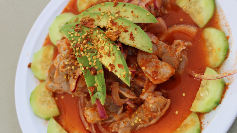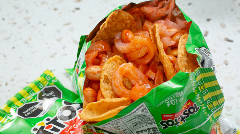 No dish embodies the complex cultural dynamic along Baja California's border with the U.S. more than tostilocos, an irresistible snack of corn chips (or other crunchy snacks) tossed with candied peanuts, slivers of cucumber and jicama, bits of chewy tamarind candy, and crunchy pork rinds, then drizzled with lime juice, hot sauce, and sweet-spicy chamoy sauce. Depending on where you get them, the ingredients can vary — the base can be anything from Flamin' Hot Cheetos to pre-spiced snacks such as Tostitos, and the saucy garnishes can include Clamato or V-8 juice, for instance. The standard presentation is to make and serve tostilocos right in the chip bag — just open the bag, add the toppings, and enjoy. Think of it as a walking taco, but with the volume turned up to 11.