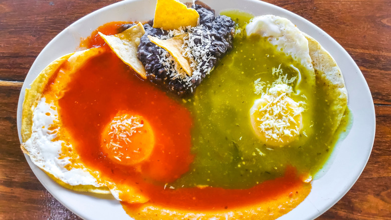 Among these favorites, huevos divorciados (or "divorced eggs") are the least likely to appear on Stateside menus, which is all the more reason to try them. They're much like the more familiar huevos rancheros — fried corn tortillas topped with refried beans, fried eggs, and spicy sauce — but with a fun twist: Instead of a big scoop of red chile sauce covering everything, you get one egg and tortilla covered in a tomato-based red sauce, while the other is covered with a tangy, tomatillo-based green sauce. In some versions of the dish, a wall of refried beans separates the two sauces, as if to keep the two warring parties safely separate. Not only does it have a festive, Christmas-y vibe, it's a great dish if you're among those who could never choose between red and green sauce for your enchiladas — huevos divorciados allows you to have both.