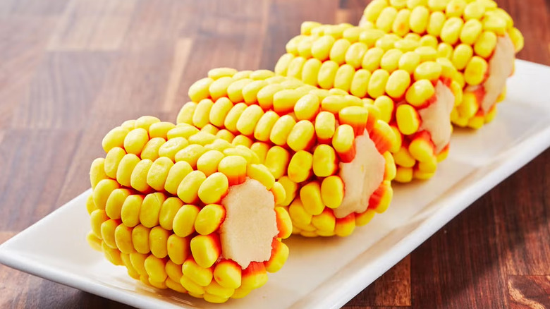 Candy corn on the cob turns the candy's name into a literal treat of corn-shaped confections, and it was especially popular due to the affordability of candy corn, particularly when bought in bulk. To make a candy corn on the cob, it requires making edible sugar cookie dough. That means no eggs and no raw flour can be used in the recipe in order to make it safe for eating. Once the dough has been created, it's a matter of rolling it into logs and then painstakingly sticking candy corn pieces around the log until it resembles a corn cob. Considering the sheer number of candy corn pieces required, it's not a great experiment to undertake for those averse to its overly sweet flavor.