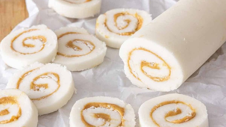 The genius of the dessert is that it requires three ingredients: potatoes, peanut butter, and powdered (or confectioners) sugar. To start, the potatoes need to be boiled to tenderness then mashed until smooth. The potatoes then get mixed with the powdered sugar and shaped into a log then pressed into a rectangle. From there, peanut butter is slathered in a layer before it's rolled back into a log. Once firm, it can be cut into slices and enjoyed.