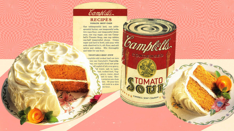 There are plenty of interesting ingredients in desserts (we're looking at your mayonnaise and tofu), and that includes tomato soup. Yes, we mean the kind of soup that is typically paired with a delicious, melty grilled cheese. According to the Campbell's Company website, the tomato soup spice cake was first spotted in the '20s or '30s in an undated cookbook. Eventually Campbell's began running its own advertisements and writing cookbooks featuring the recipe with fillings from candied fruit to nuts. It became so popular that, in 1960, it was the first recipe to ever appear on the label of a canned soup.