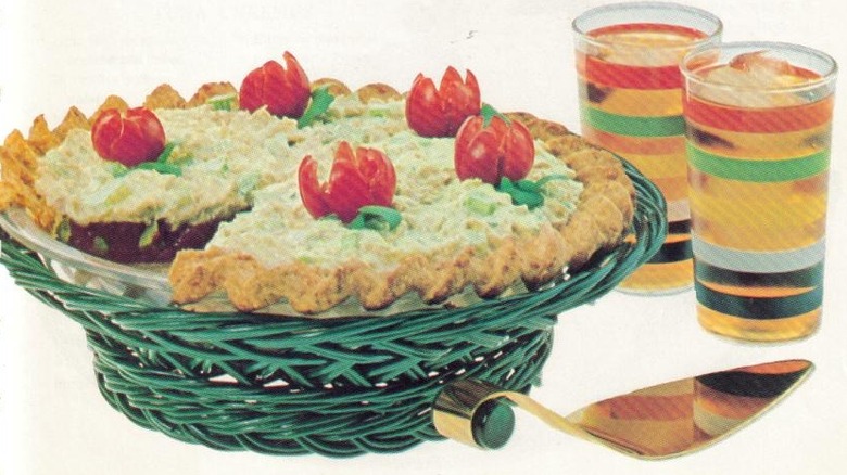 Due to its affordability and the incredible marketing campaigns by companies like Jell-O, gelatin salads became all the rage, particularly in the '70s. One such "salad" was the summer salad pie, better known by its ingredients of gelatin and tuna. Technically, this dish was eaten as a more savory option, but we've included it due to the lemon Jell-O layer that adds a jarring sweetness. The basic recipe uses a cheese pie crust with a lemon Jell-O, tomato sauce, onion, celery, and olive center. That is then topped with tuna salad and garnished with tomatoes. Gelatin dishes are still made across the country, but the summer salad pie has mostly been retired from the kitchen.