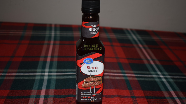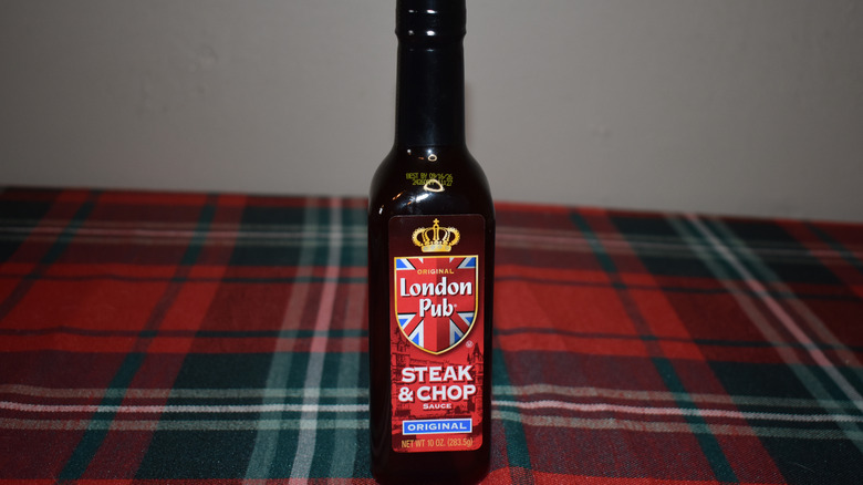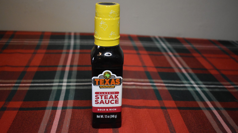 The next sauce on our list comes from a fairly well-known mid-range steakhouse chain: Texas Roadhouse. They have an entire line of steak sauces, so I went with their original Bold and Rich sauce. It has the usual suspects on the ingredient list: vinegar, tomato paste, raisin paste, salt, tamarind extract, garlic, and onion. While it's created for steak, this sauce can also be used as a dip or marinade for chicken, carne asade, and many other dishes.