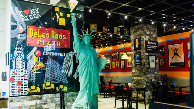 The pizza parlor isn't nestled in South Street Dining with most of the other restaurants. Instead, you'll find it right beside the first floor east entrance, just a few steps shy of the aquarium and rotunda. The restaurant features a modest dining area, where you'll find a miniature Statue of Liberty, arcade games, and the walls covered in New York memorabilia.
